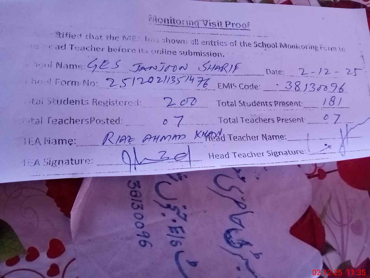 | EMIS Code: 38130096 | Name of School: GES JANJOON SHARIF | |||