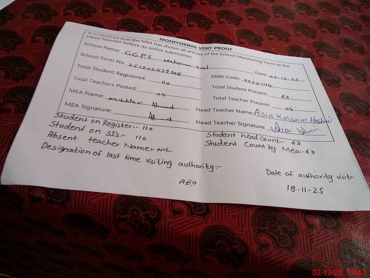 | Attendance Register | Head Teacher | MEA with School | Visit Proof |
