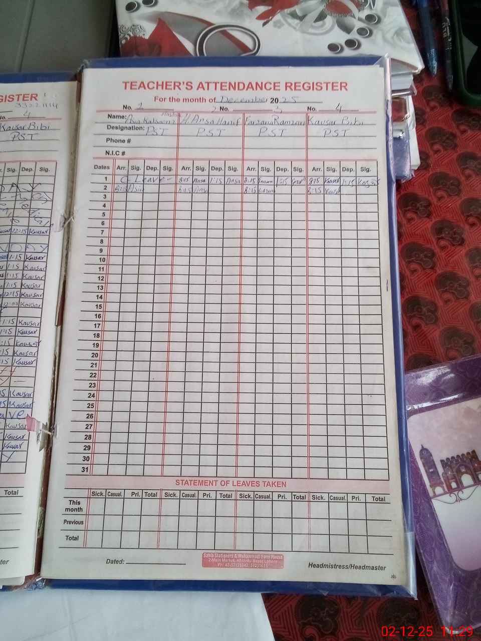 | CNIC | Full Name | Designation | R/C | Absence During Last Calender Month |
