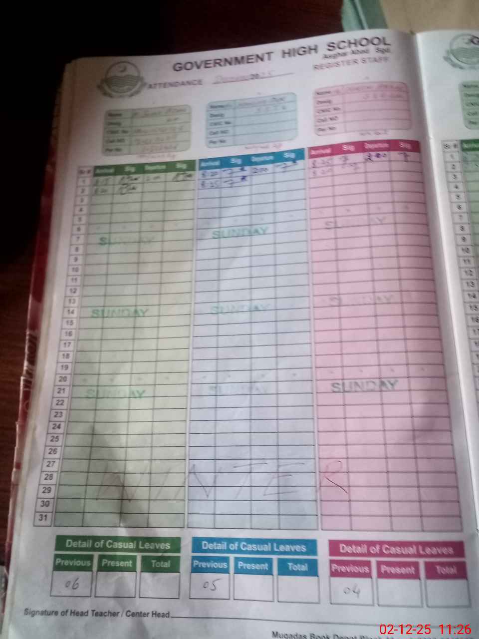 | CNIC | Full Name | Designation | R/C | Absence During Last Calender Month |