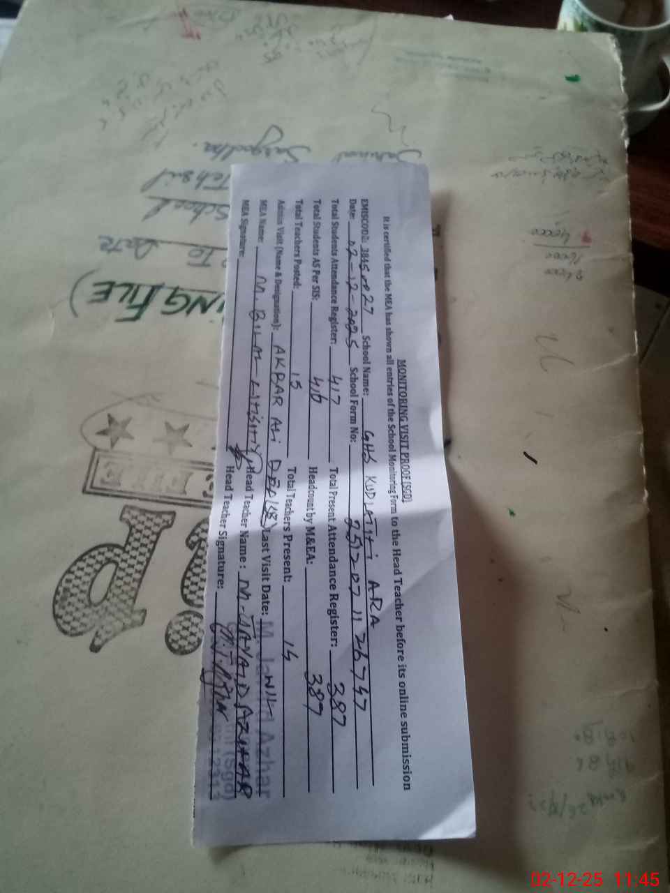| Attendance Register | Head Teacher | MEA with School | Visit Proof |