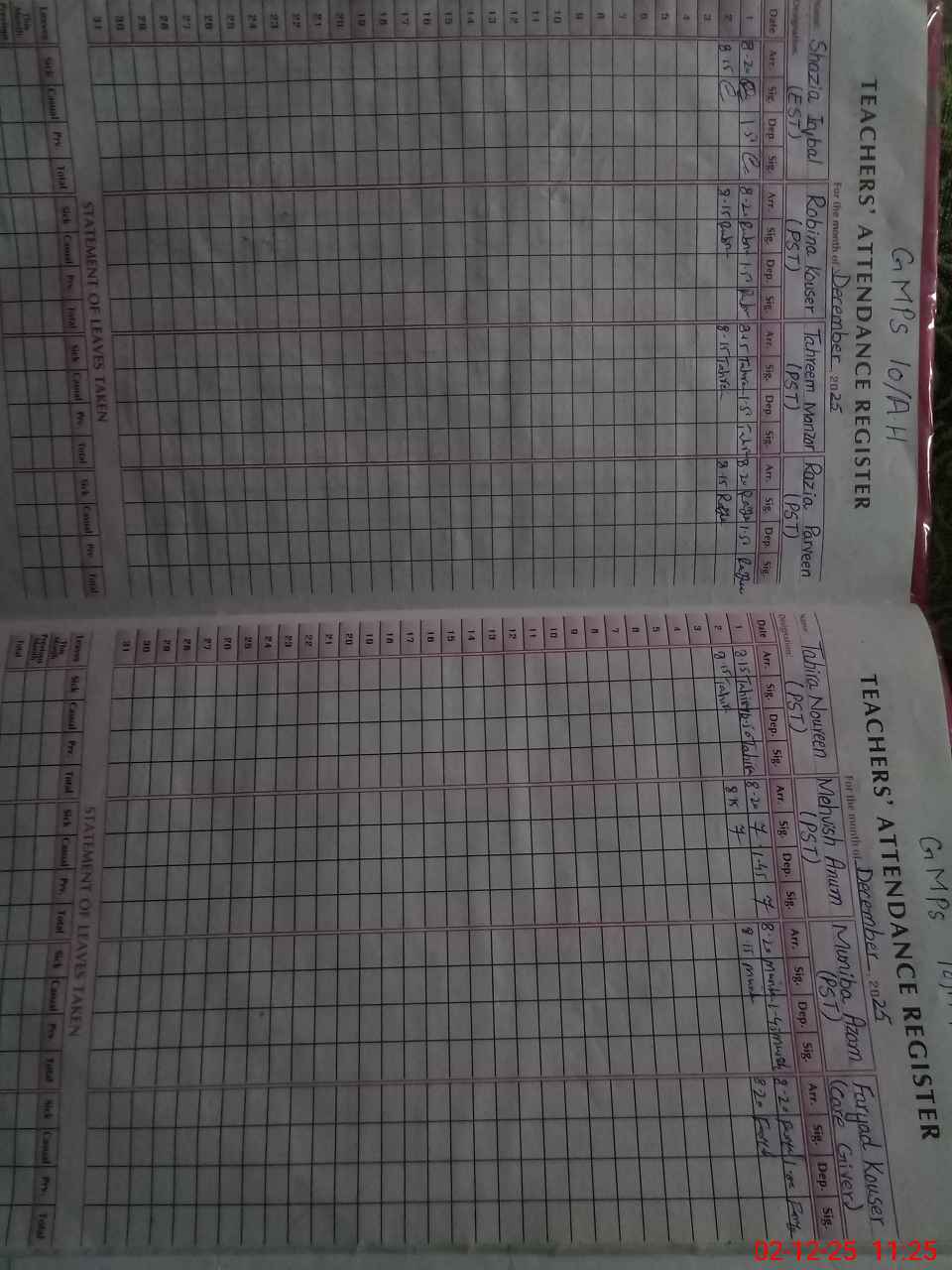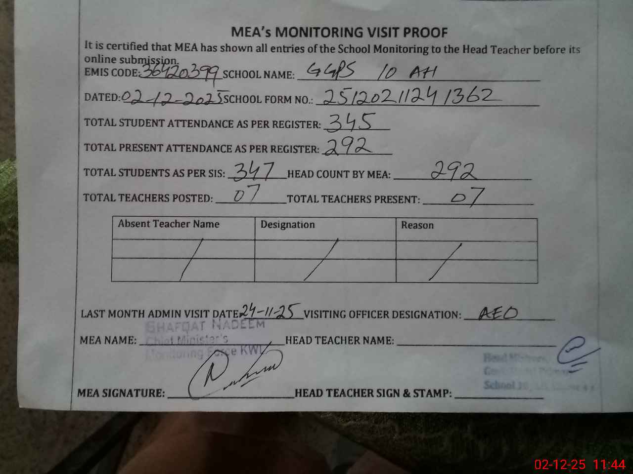 | Attendance Register | Head Teacher | MEA with School | Visit Proof |