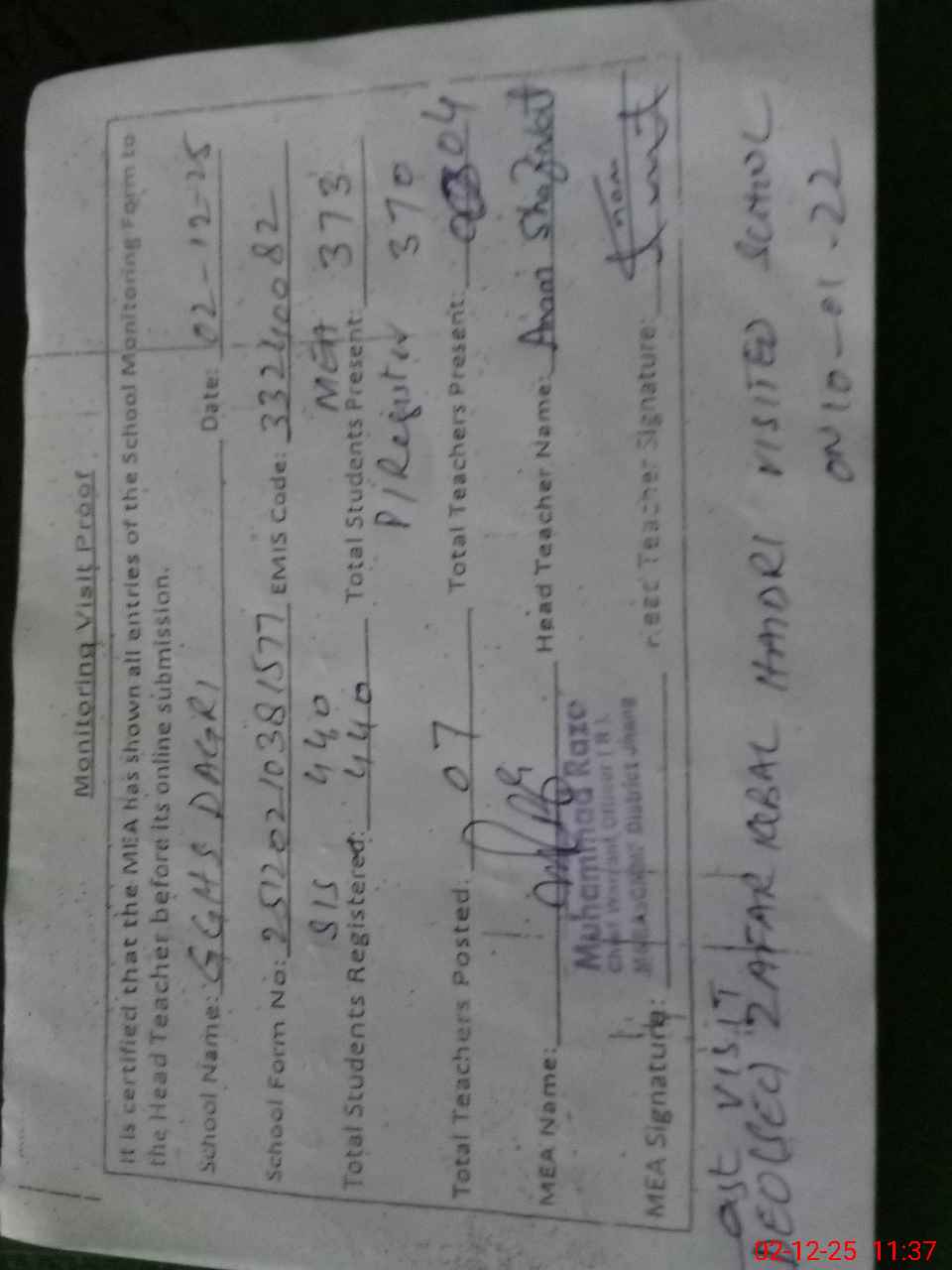 | Attendance Register | Head Teacher | MEA with School | Visit Proof |