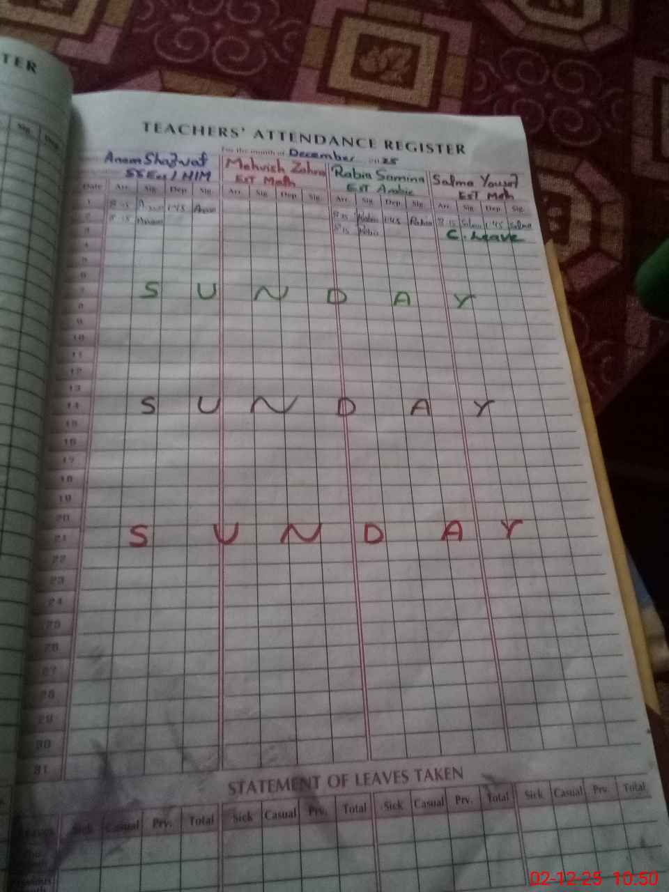 | CNIC | Full Name | Designation | R/C | Absence During Last Calender Month |