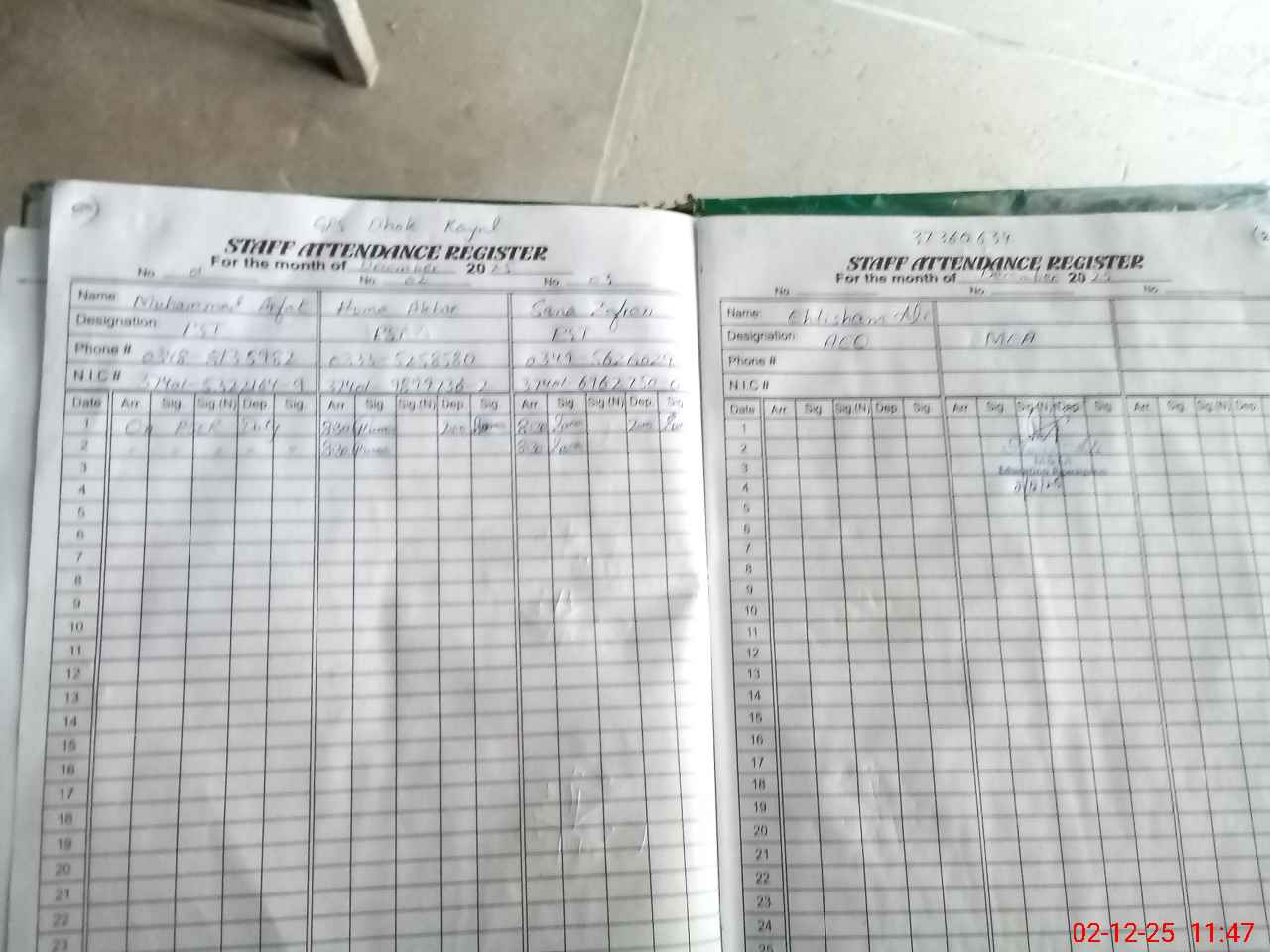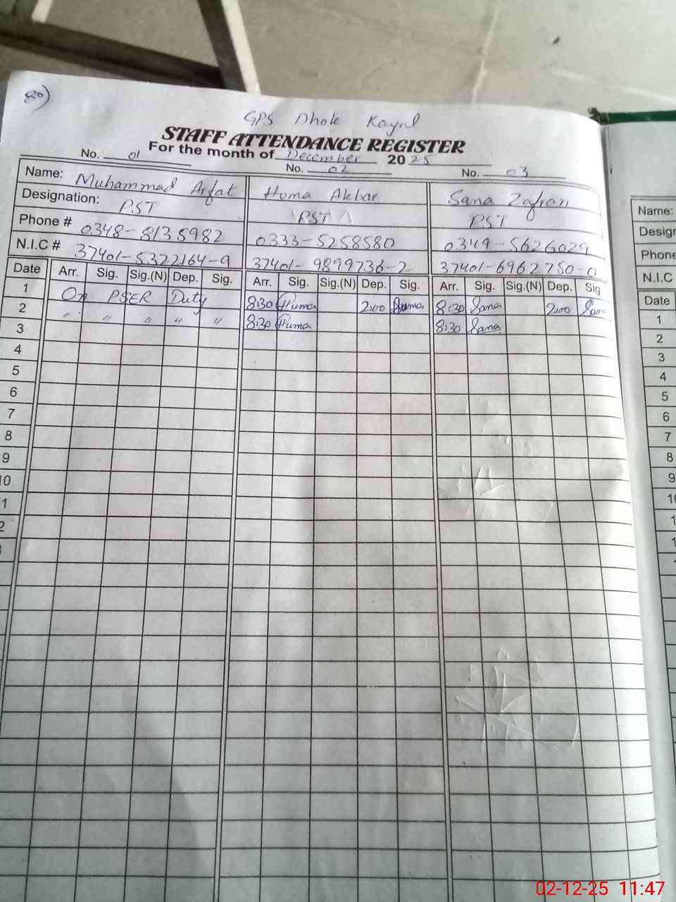 | CNIC | Full Name | Designation | R/C | Absence during last cal. month |