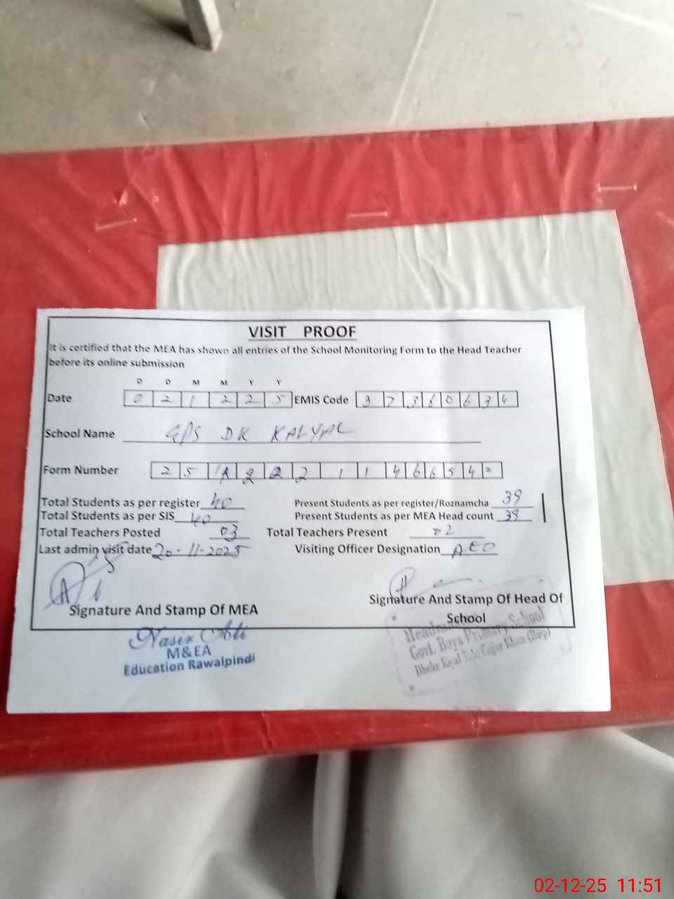 | Attendance Register | Head Teacher | MEA with School | Visit Proof |