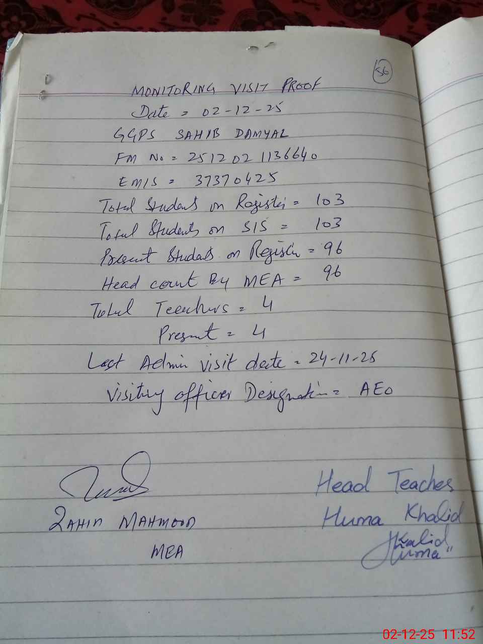 | Attendance Register | Head Teacher | MEA with School | Visit Proof |