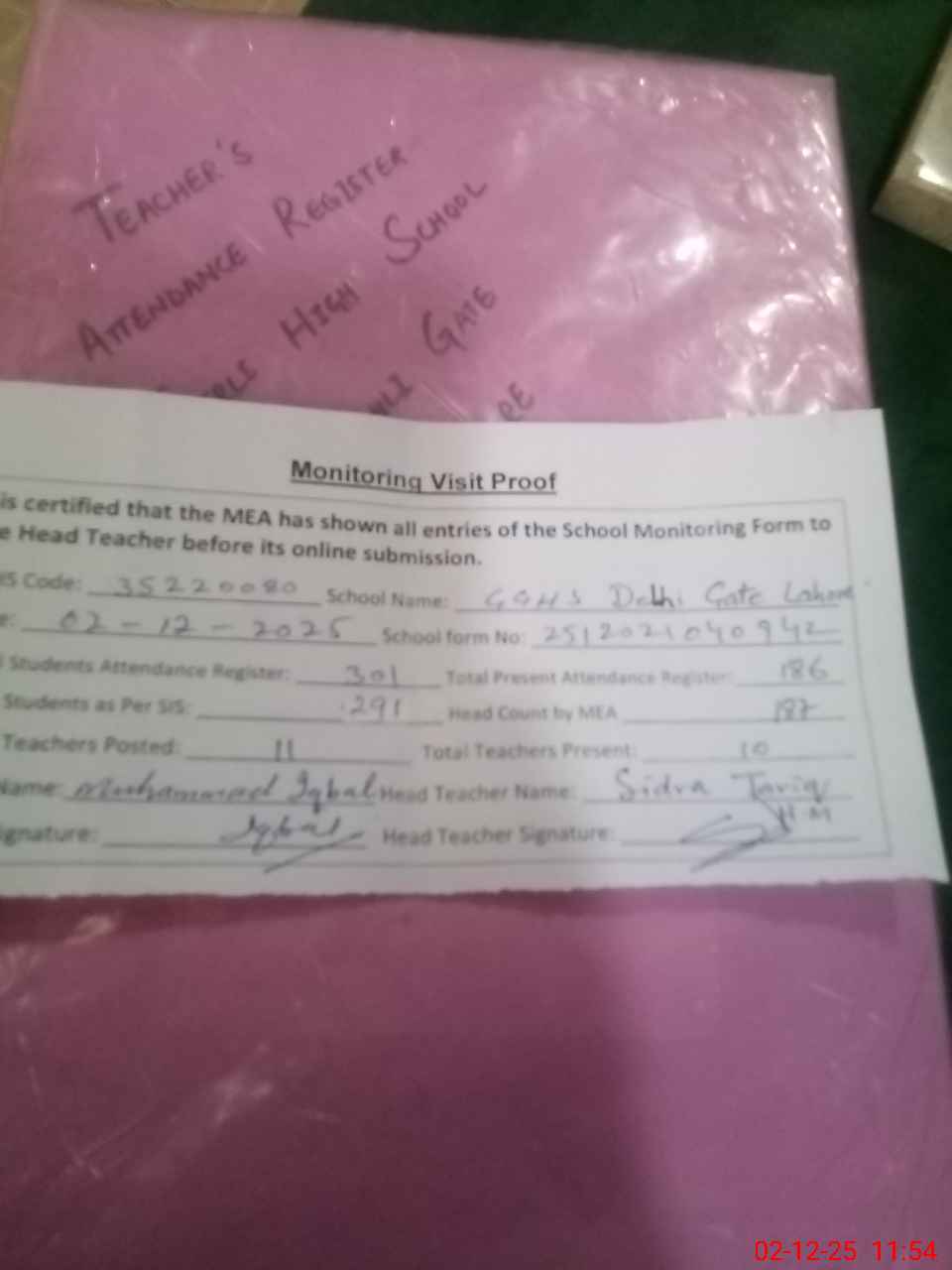 | Attendance Register | Head Teacher | MEA with School | Visit Proof |