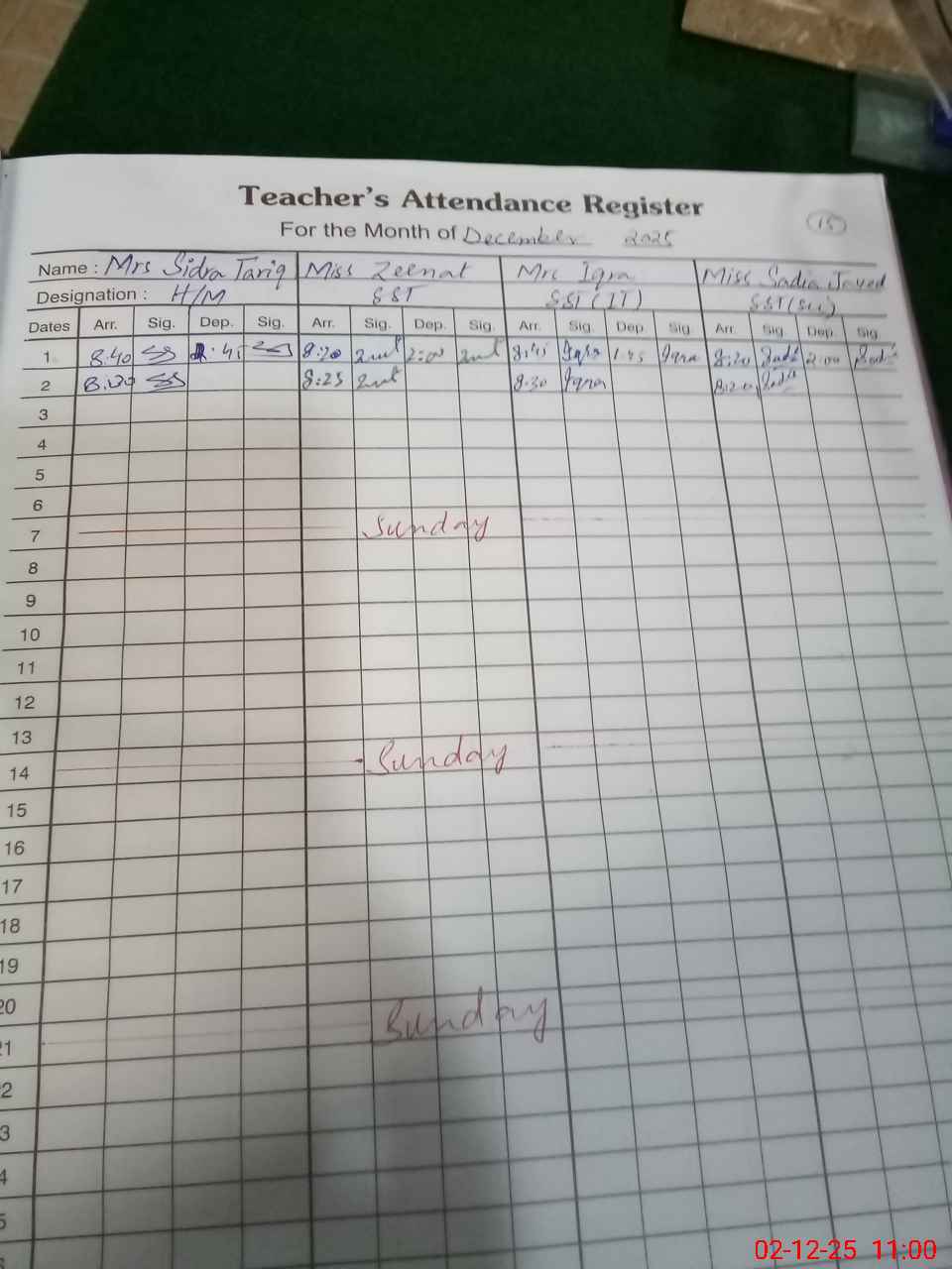 | CNIC | Full Name | Designation | R/C | Absence During Last Calender Month |