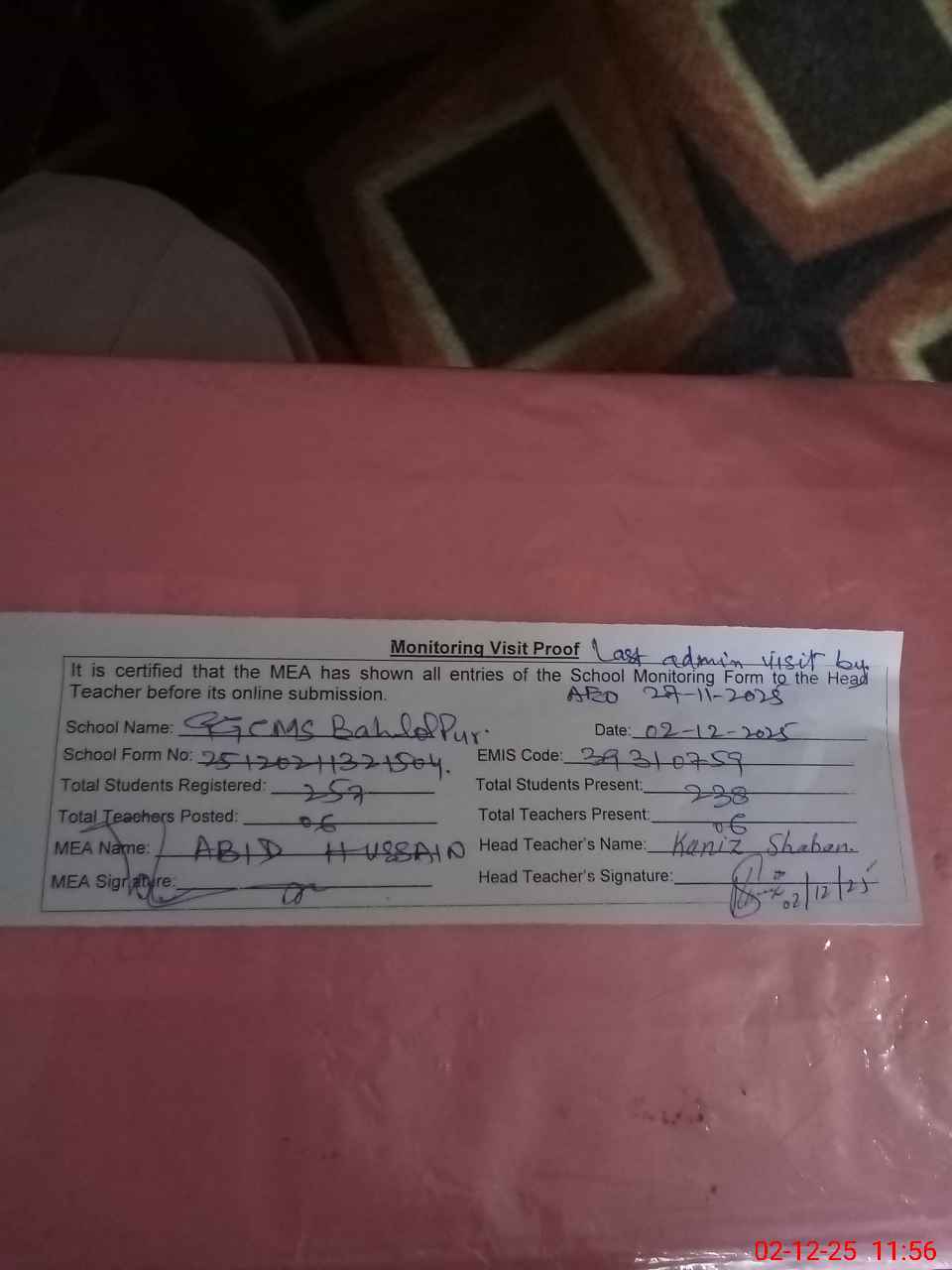 | EMIS Code: 39310759 | Name of School: GGCMS BAHLOL PUR | |||