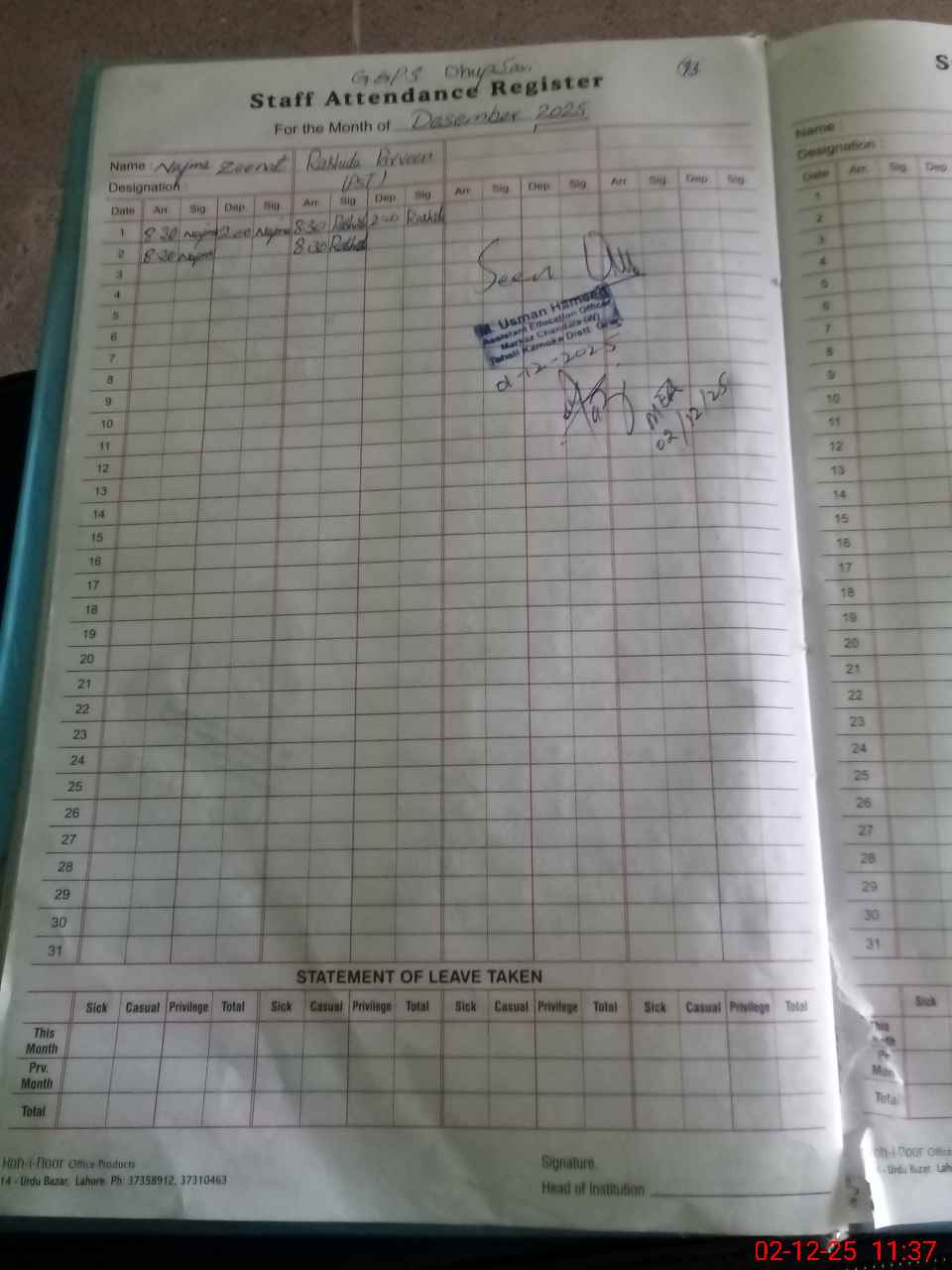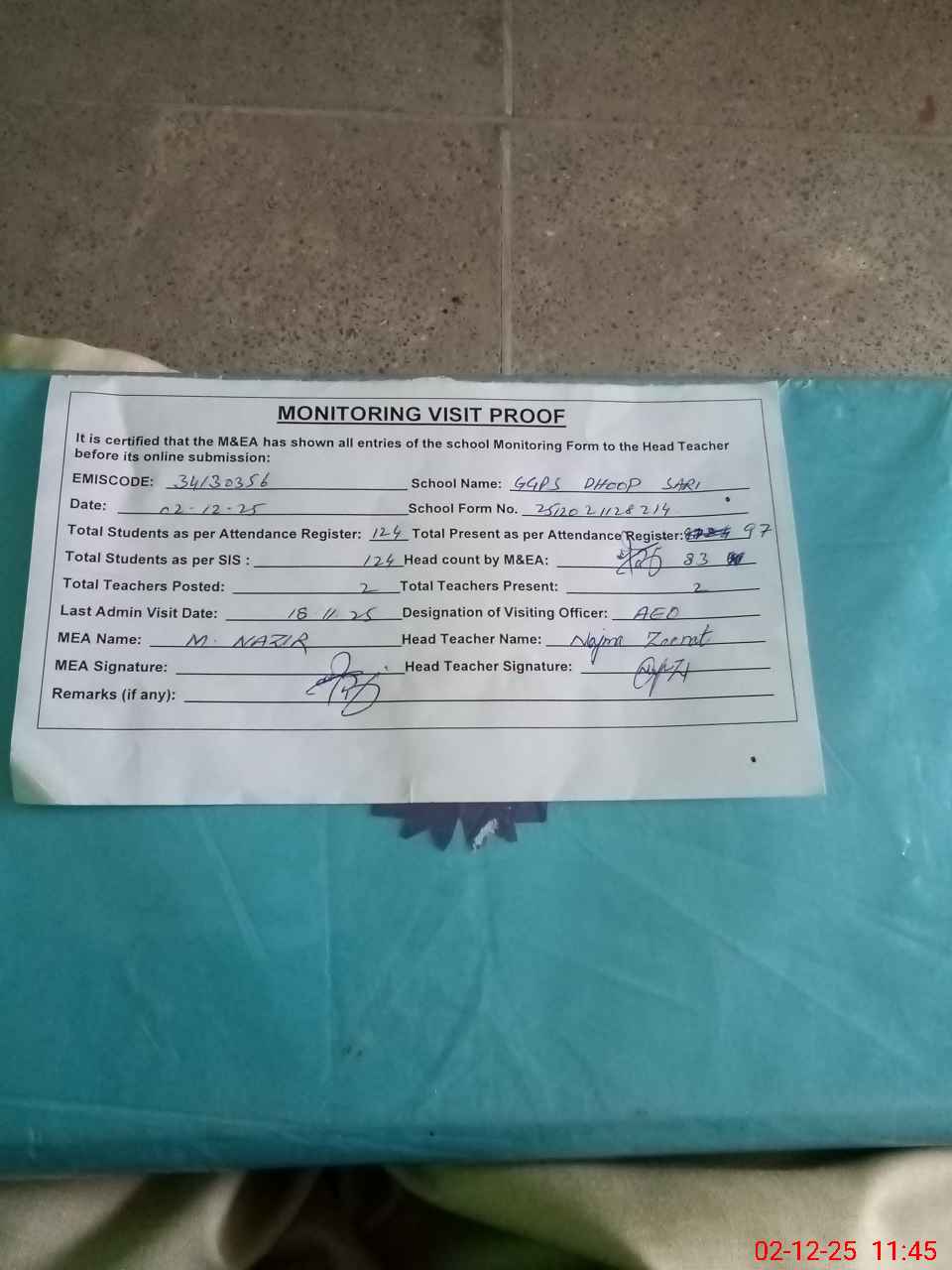 | Attendance Register | Head Teacher | MEA with School | Visit Proof |