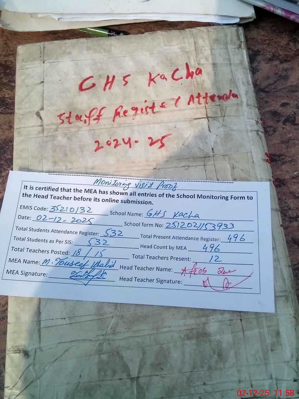 | Attendance Register | Head Teacher | MEA with School | Visit Proof |