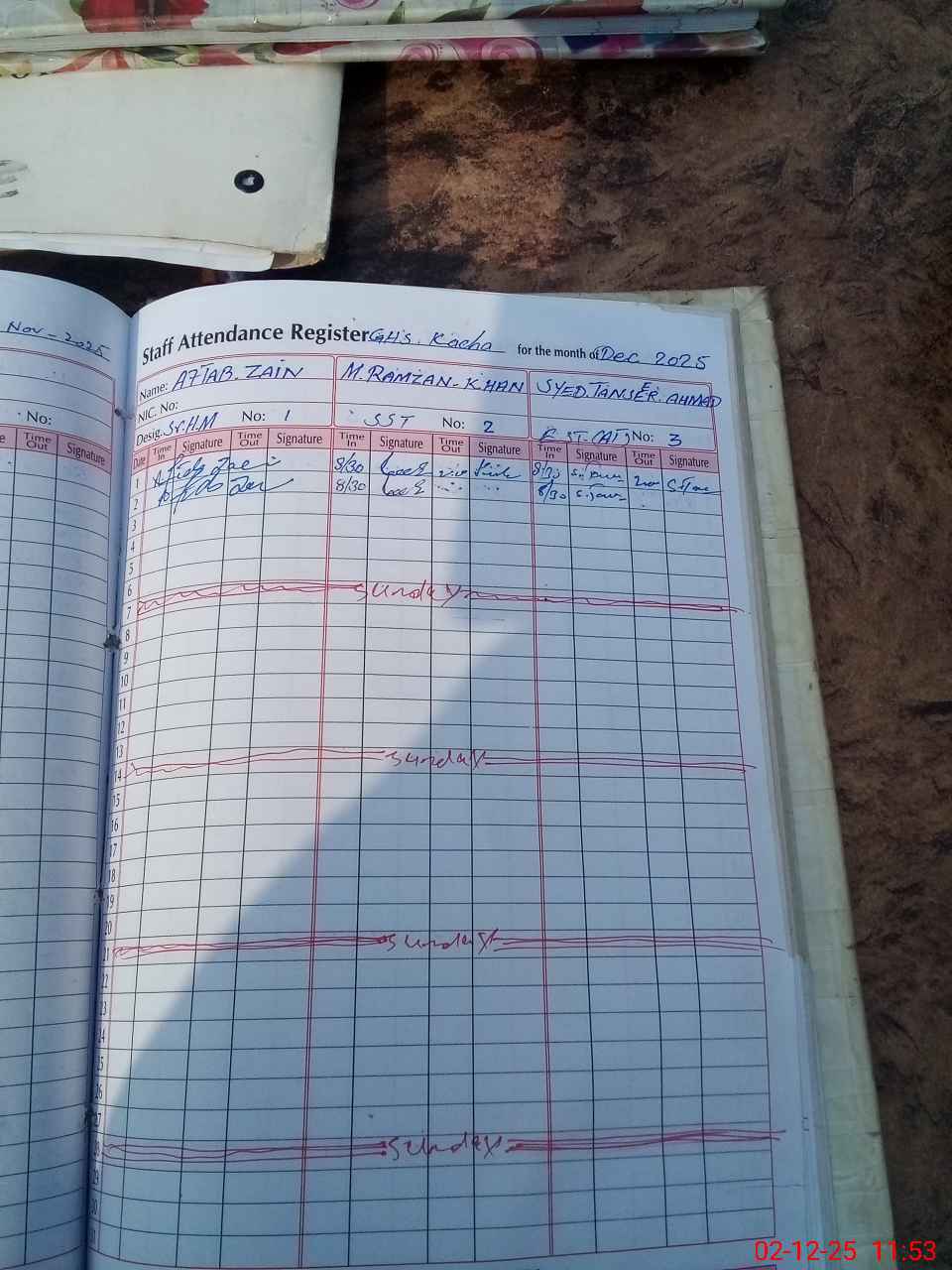 | CNIC | Full Name | Designation | R/C | Absence During Last Calender Month |