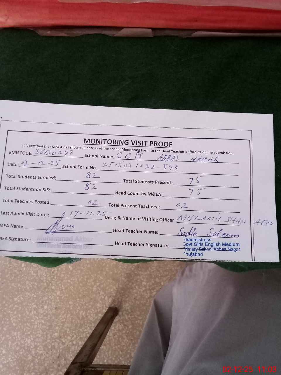 | Attendance Register | Head Teacher | MEA with School | Visit Proof |