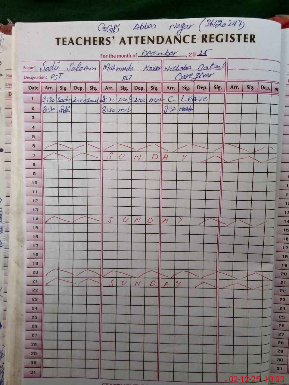 | CNIC | Full Name | Designation | R/C | Absence During Last Calender Month |
