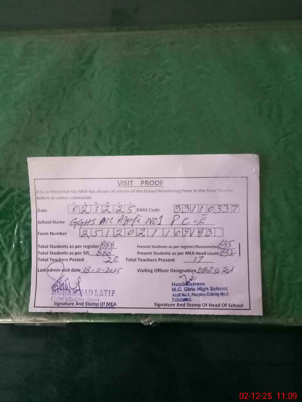 | EMIS Code: 33110337 | Name of School: GGHS MC AZAFI NO.1 PEOPLES COLONY NO.2 | |||