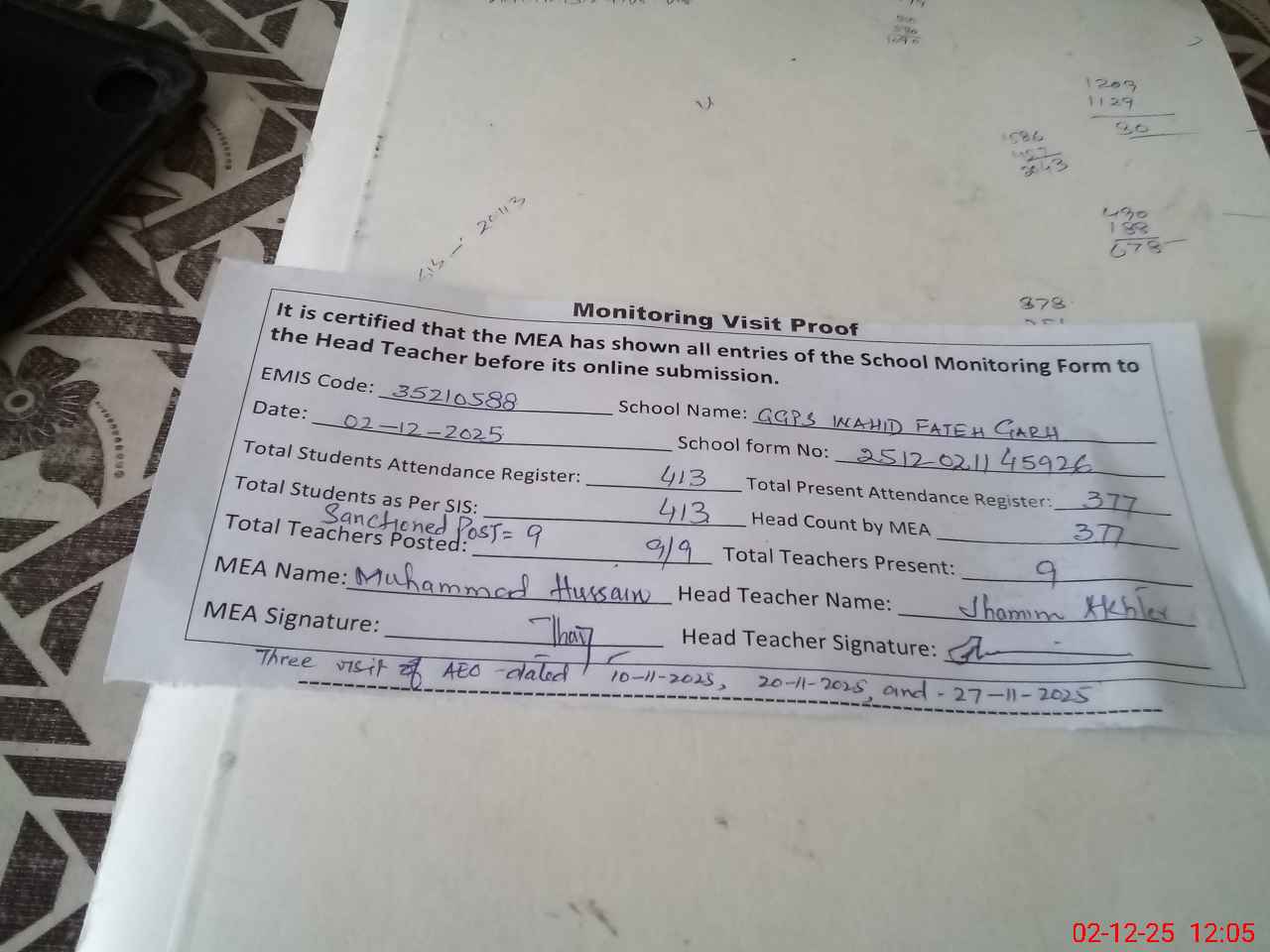 | Attendance Register | Head Teacher | MEA with School | Visit Proof |
