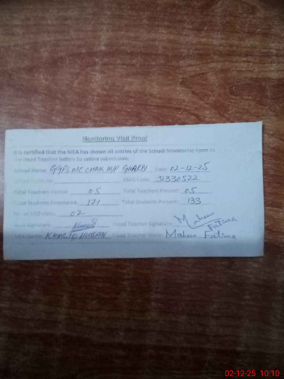 | Attendance Register | Head Teacher | MEA with School | Visit Proof |