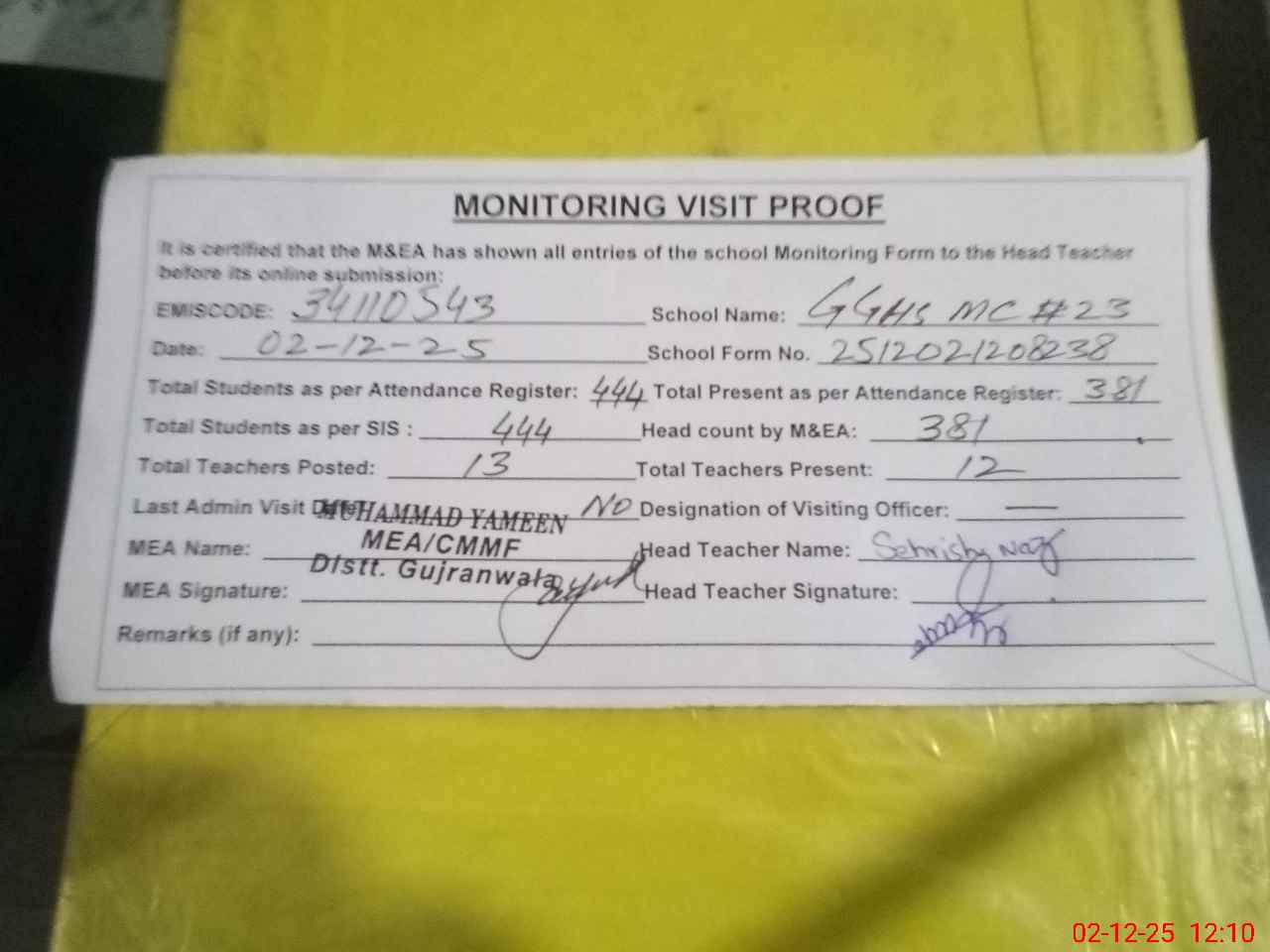 | EMIS Code: 34110543 | Name of School: GGHS MC NO.23 GUJRANWALA | |||