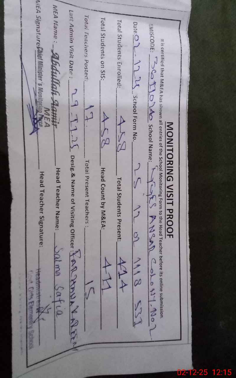 | EMIS Code: 36110240 | Name of School: GGES ANSAR COLONY NO. 2 MULTAN CITY | |||