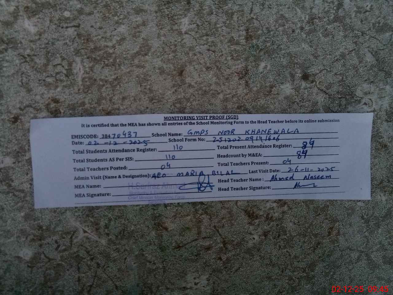 | EMIS Code: 38470437 | Name of School: GMPS NOOR KHAN-E-WALA | |||