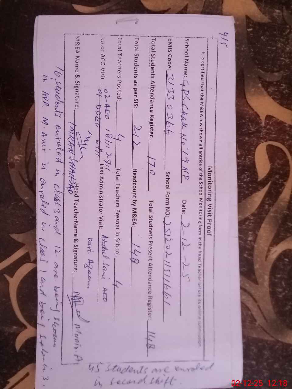 | Remarks (Use Separate Page if Required): 16 students are enrolled in class 3 and 12 are being shown in PMIU App M Amir is enrolled in class 1 and being shown in class 3 | |||||