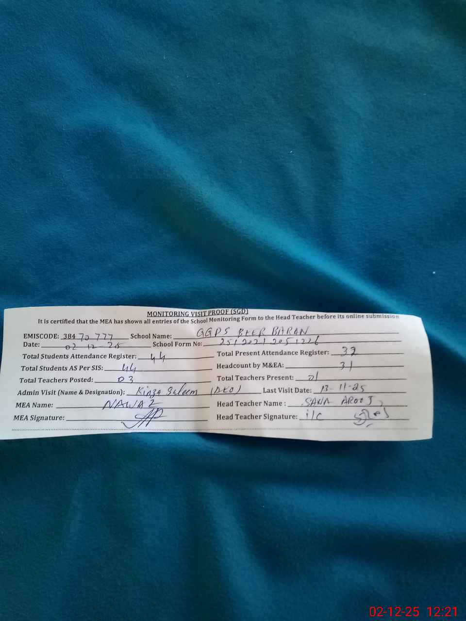 | Attendance Register | Head Teacher | MEA with School | Visit Proof |