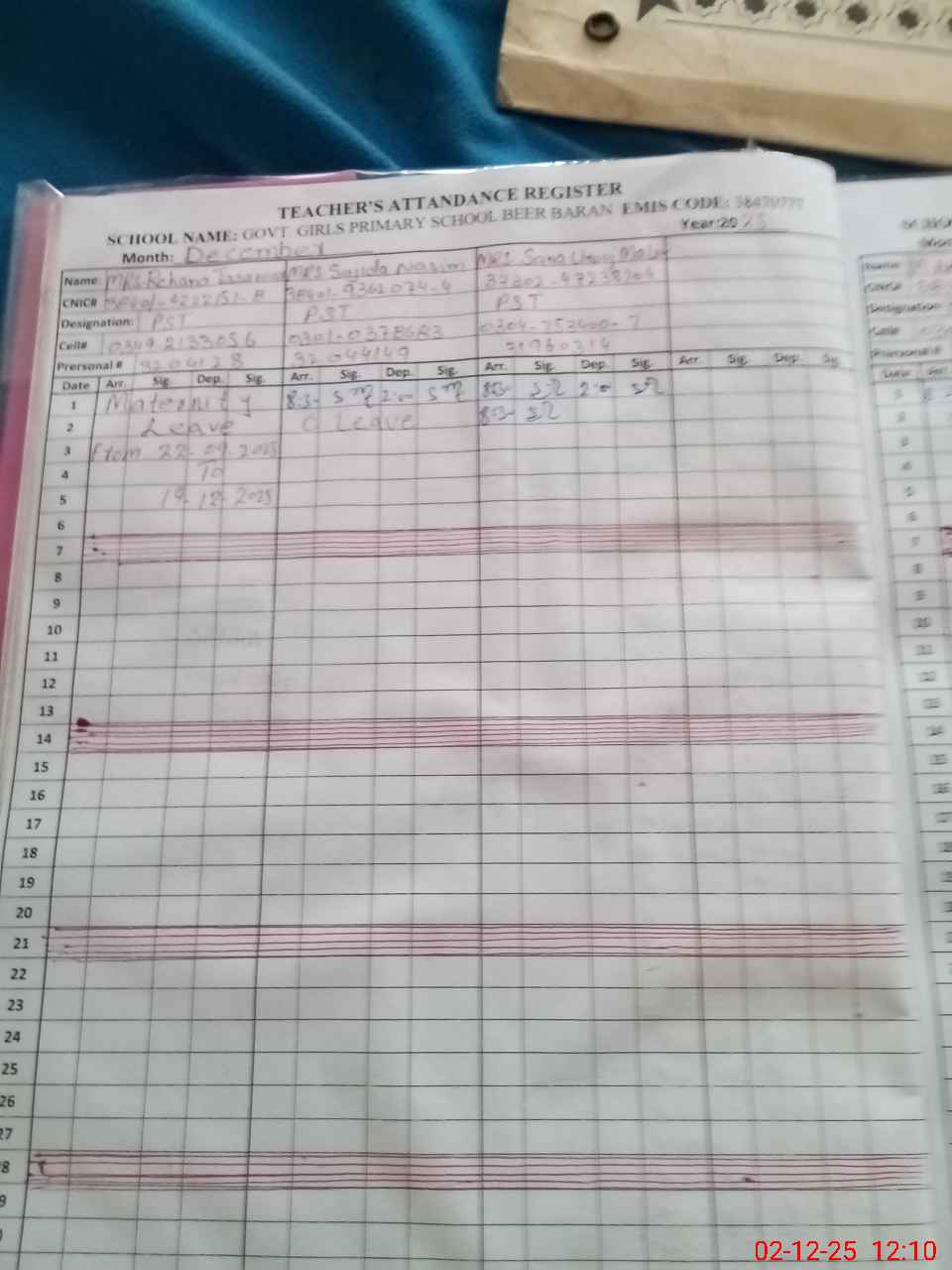 | CNIC | Full Name | Designation | R/C | Absence During Last Calender Month |