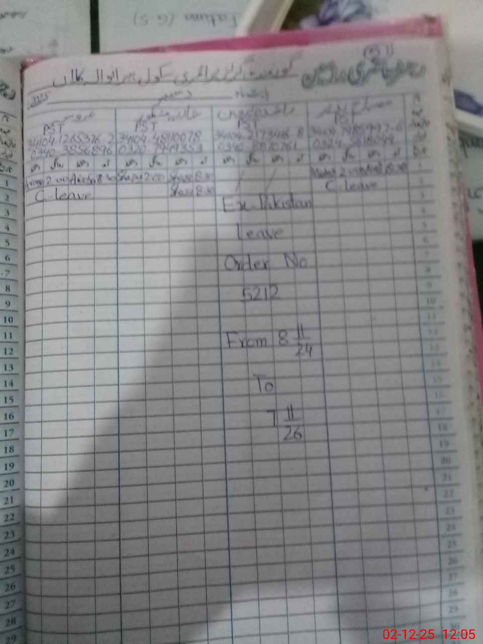 | CNIC | Full Name | Designation | R/C | Absence During Last Calender Month |