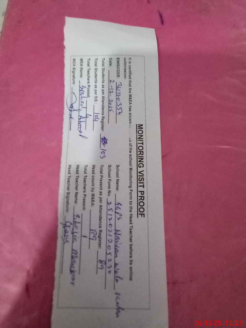 | Attendance Register | Head Teacher | MEA with School | Visit Proof |