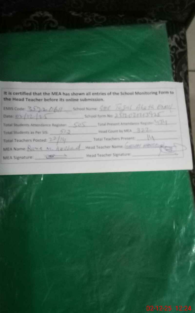 | Remarks (Use Separate Page if Required): Students as per register 505 Students as per register present 434 Students as per Head count 322 Difference found 112 Students students attendance percentage 64 School Cleaning poor NSB record not maintain month of November | |||||
