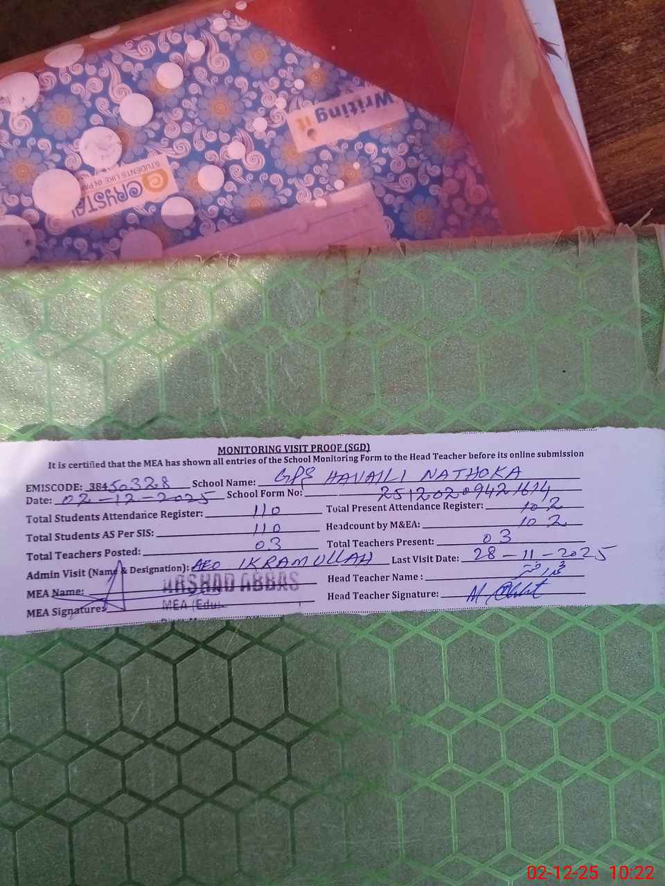 | Attendance Register | Head Teacher | MEA with School | Visit Proof |