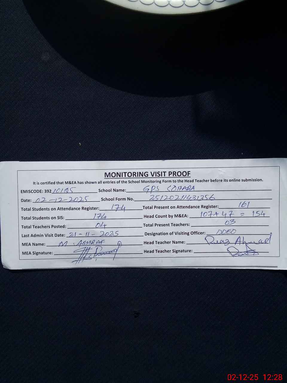 | Attendance Register | Head Teacher | MEA with School | Visit Proof |