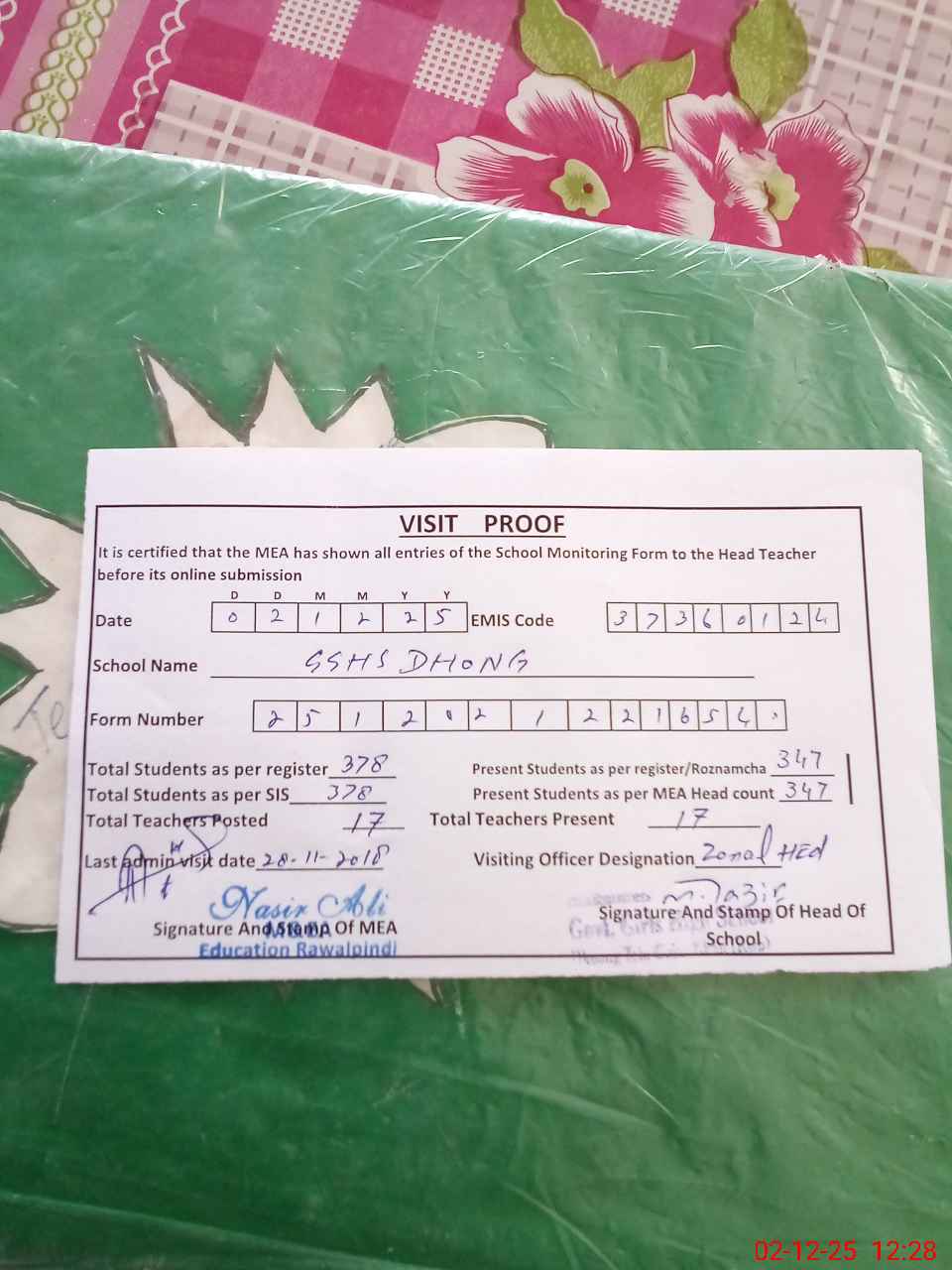 | Certified that this School was Inspected by the Undersigned MEA/DMO Today and the Information Stated Above is as Per Record. | |||||