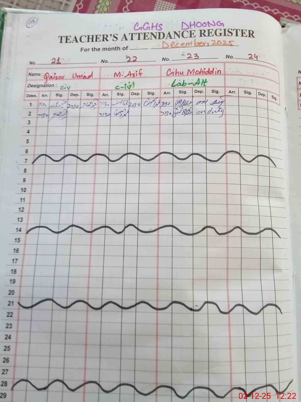 | CNIC | Full Name | Designation | R/C | Absence during last cal. month |