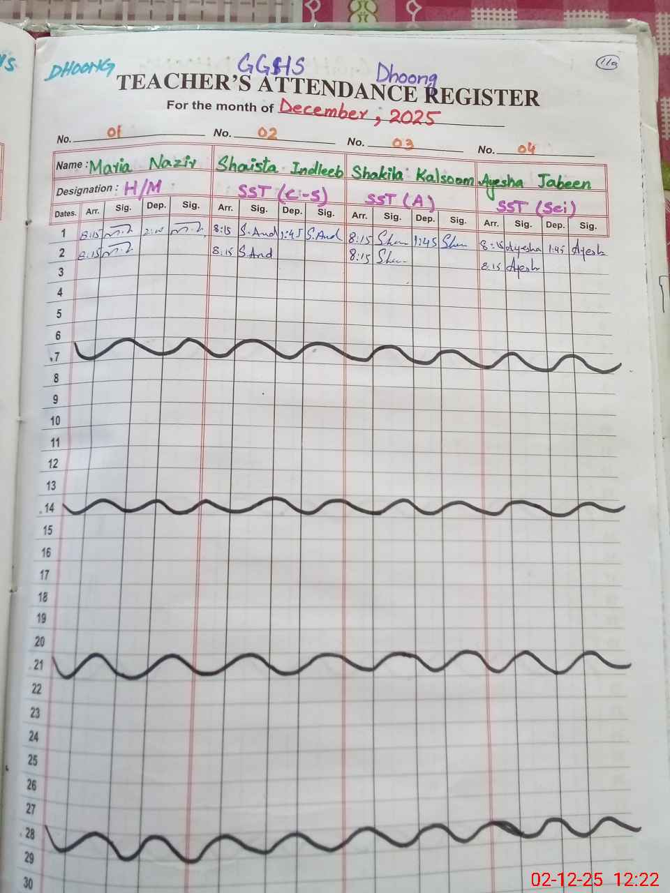 | CNIC | Full Name | Designation | R/C | Absence During Last Calender Month |