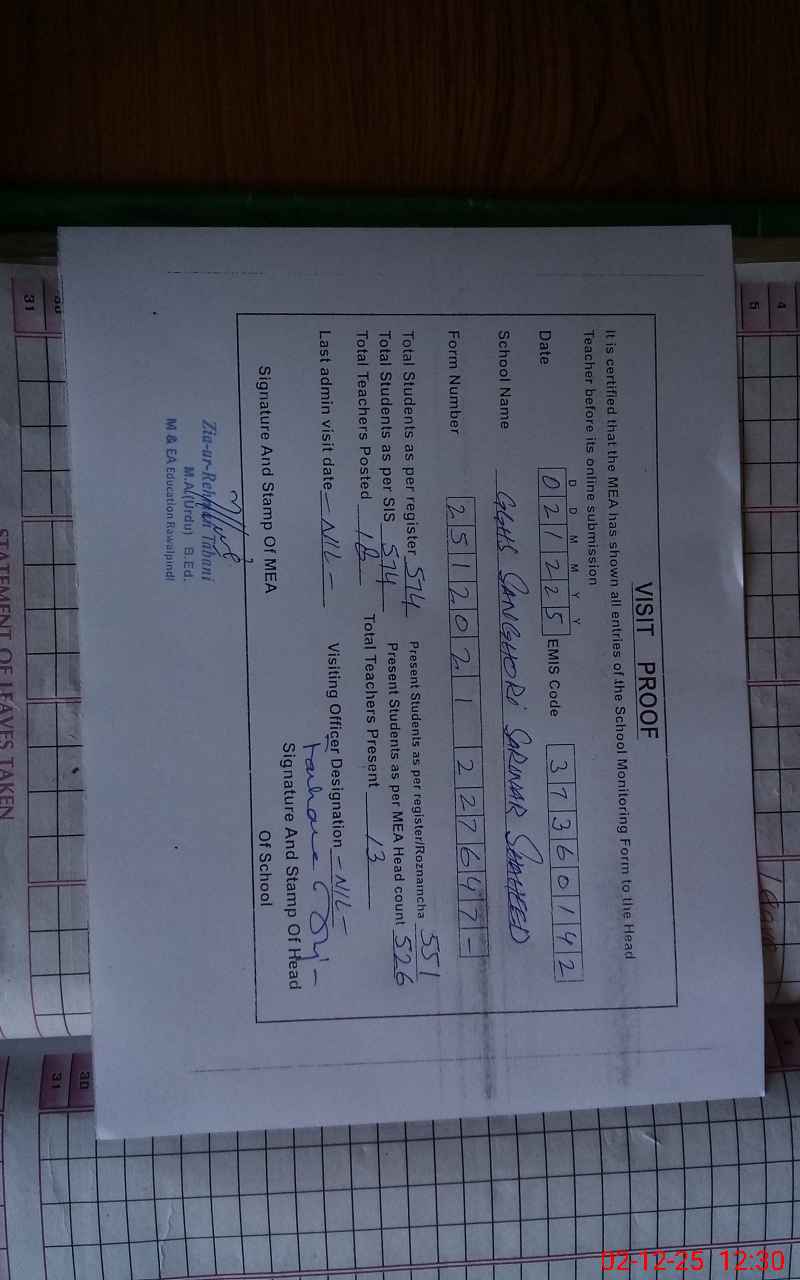 | EMIS Code: 37360142 | Name of School: GGHS SANGHORI SARWAR SHAHEED | |||