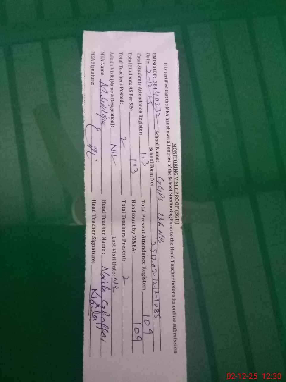 | Attendance Register | Head Teacher | MEA with School | Visit Proof |