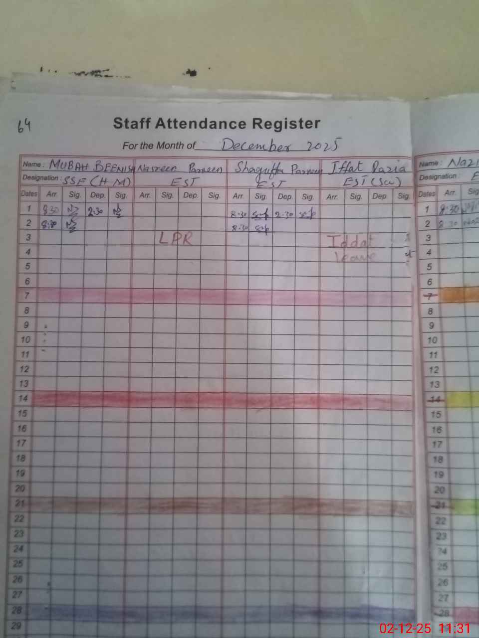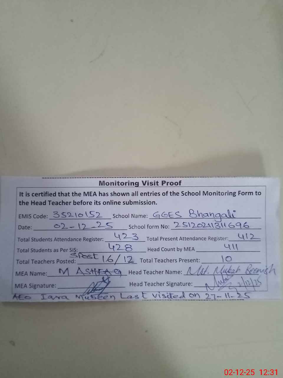 | Remarks (Use Separate Page if Required): Teachers Sanctioned Post 16 and Filled 12 AEO Iqrs Mubeen last visit on 27-11-25 EST Iffat Razia on Iddat from 20-11-25 but her leave awaiting for approval from Deputy DEO so mark him absent 35210152 | |||||