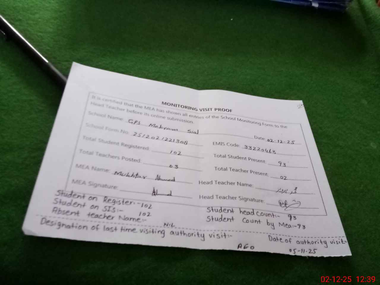 | EMIS Code: 33220463 | Name of School: GPS MEHRAM SIAL | |||