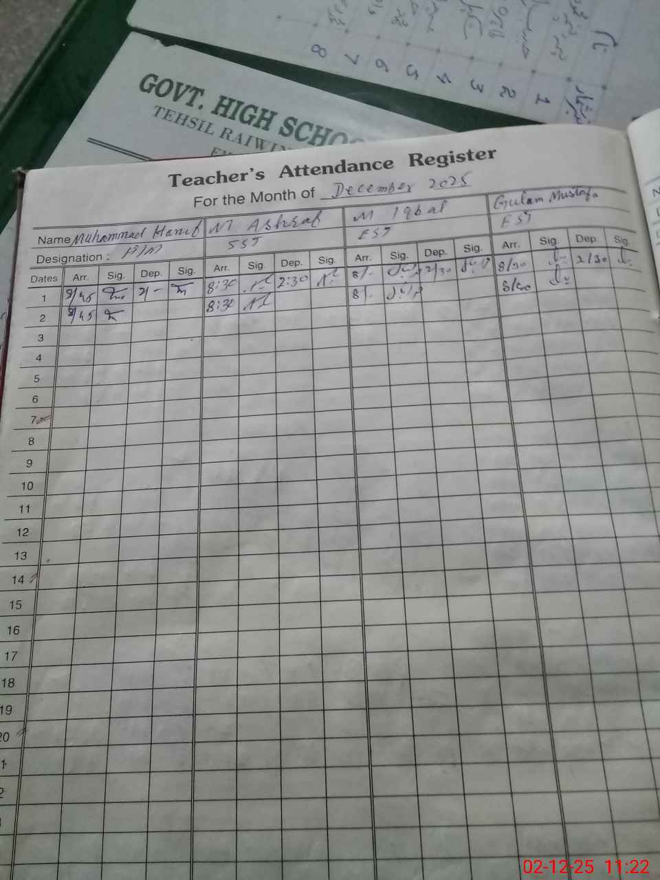 | Remarks (Use Separate Page if Required): Jnr Clerk Hamza Sagheer is absent since 10 Nov 2025 Cracks observed in ceilings and shades of seven classrooms which apparently seems dangerous AEO Visited this school on 29 Oct 2025 Girls are enrolled in this school up to eight class that seems contrary to rules for girls enrollment in boys schools 35220186 | |||||