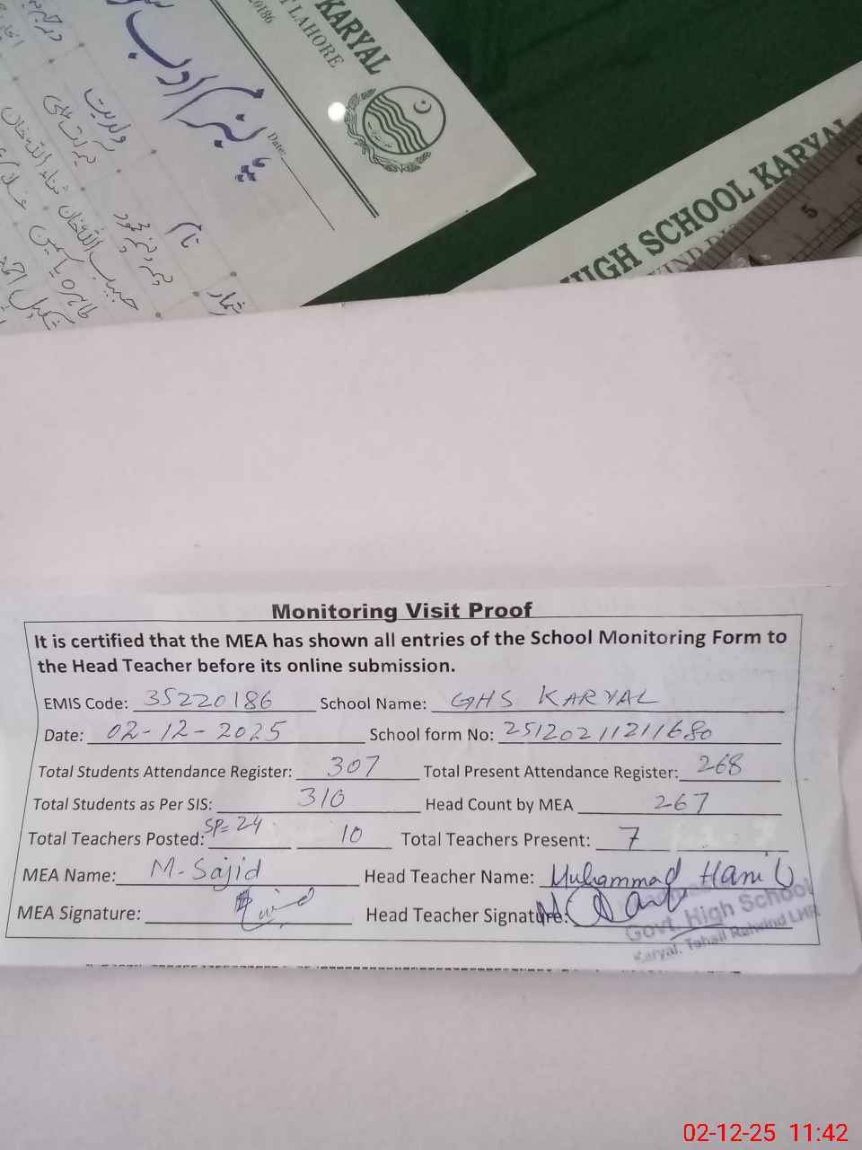 | Attendance Register | Head Teacher | MEA with School | Visit Proof |