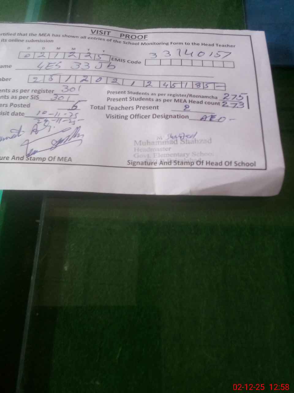 | Attendance Register | Head Teacher | MEA with School | Visit Proof |