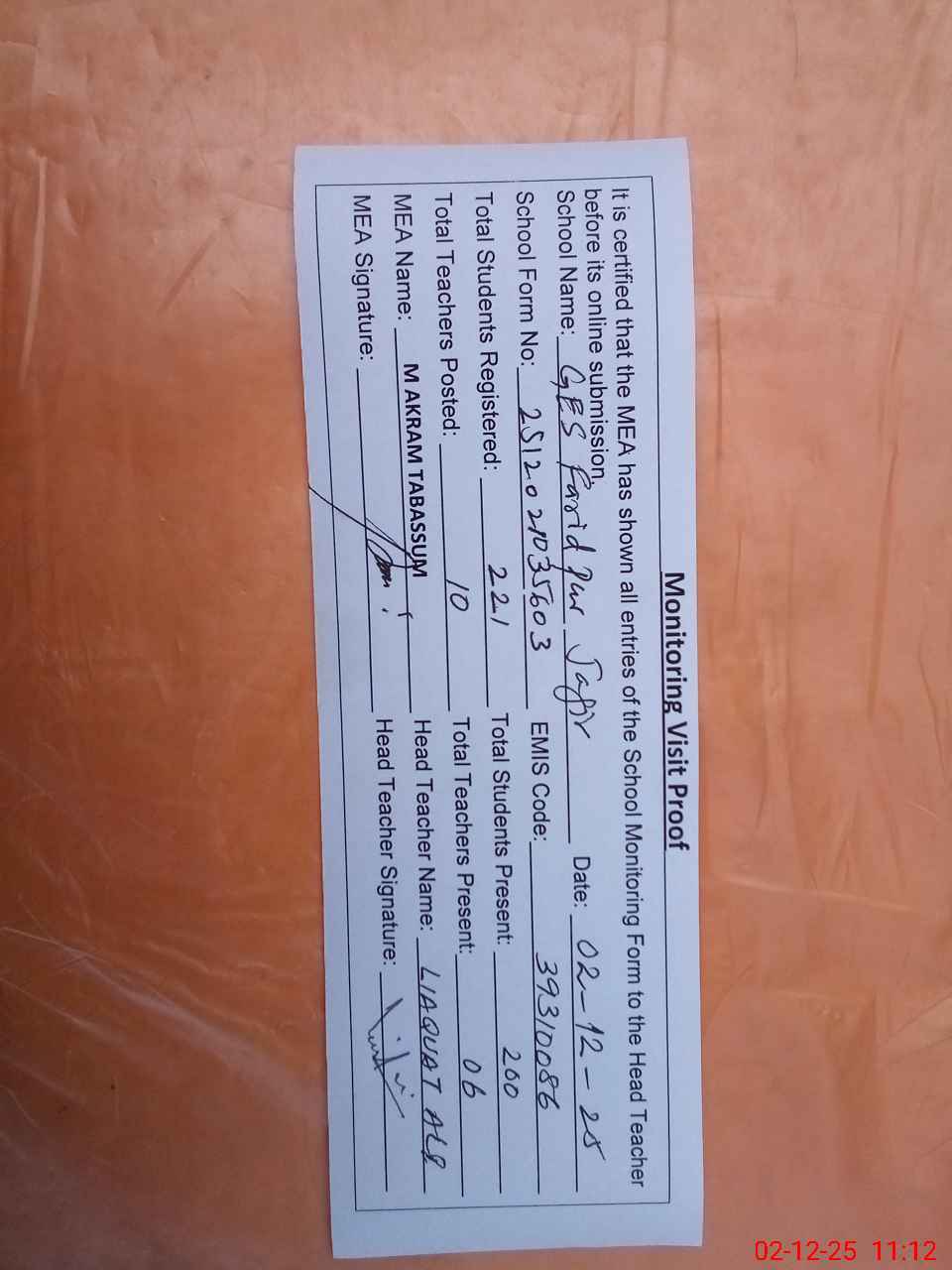 | Attendance Register | Head Teacher | MEA with School | Visit Proof |