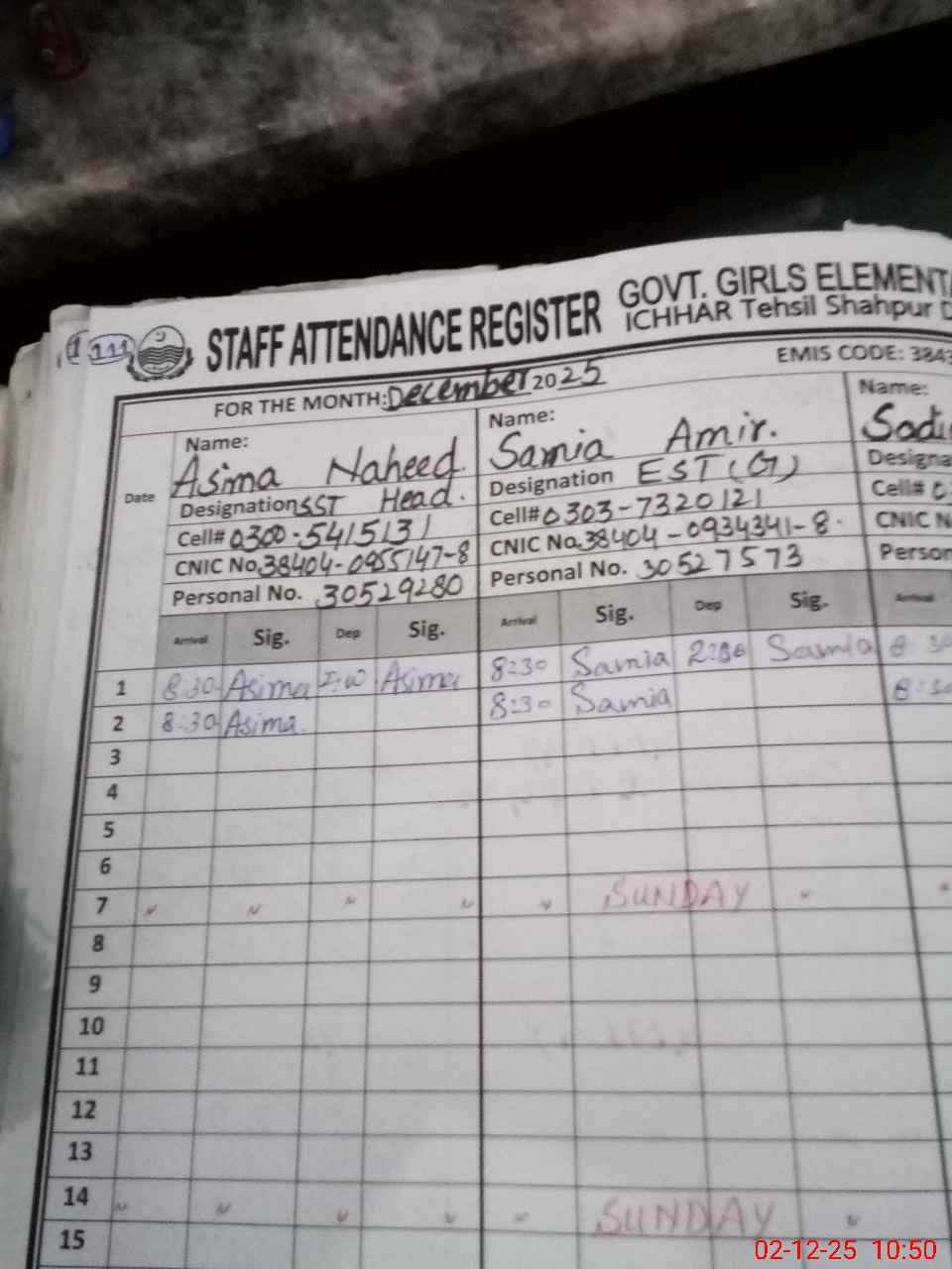 | CNIC | Full Name | Designation | R/C | Absence during last cal. month |