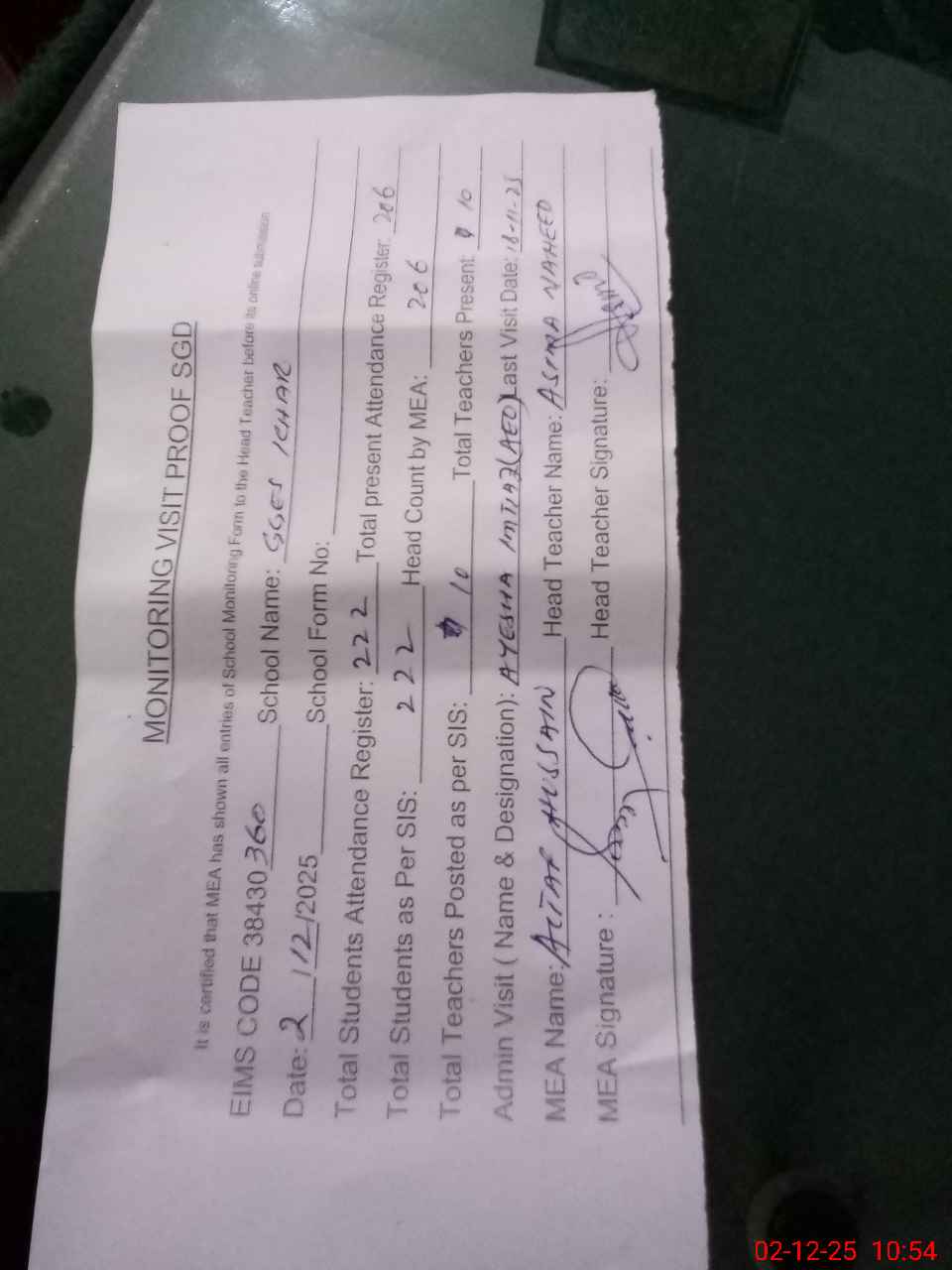 | Attendance Register | Head Teacher | MEA with School | Visit Proof |