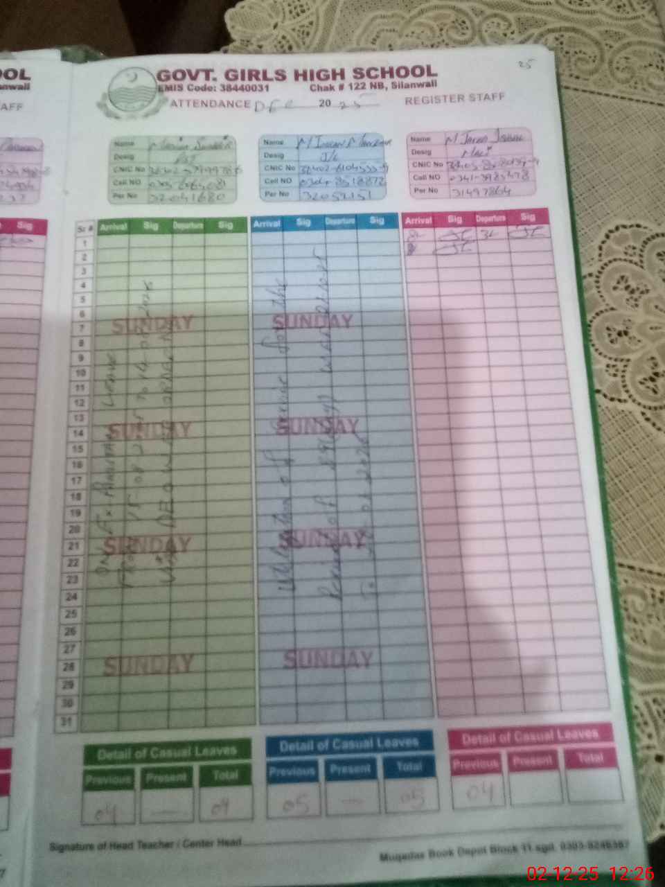 | CNIC | Full Name | Designation | R/C | Absence During Last Calender Month |