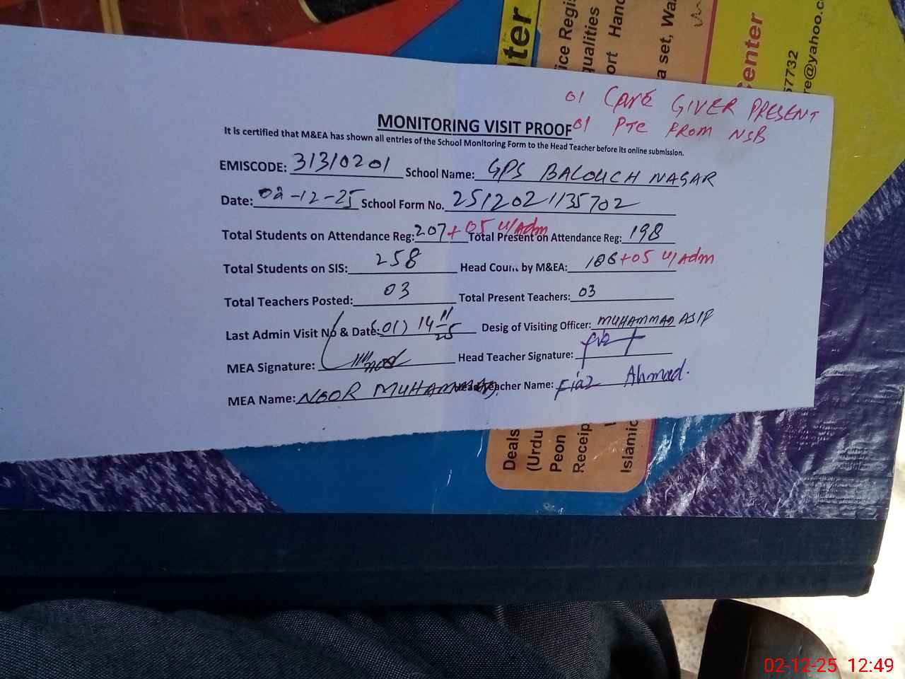 | Attendance Register | Head Teacher | MEA with School | Visit Proof |
