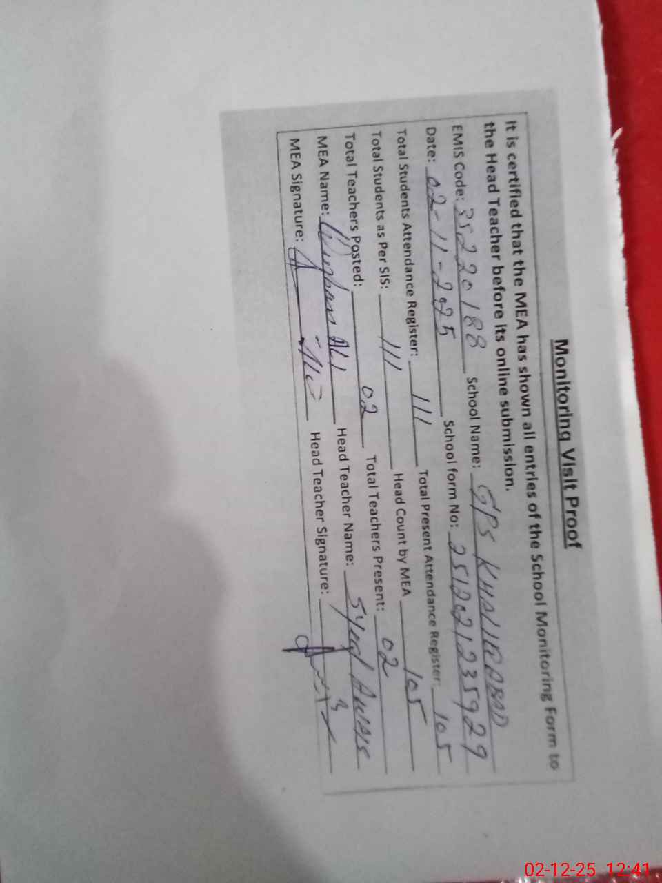 | Attendance Register | Head Teacher | MEA with School | Visit Proof |