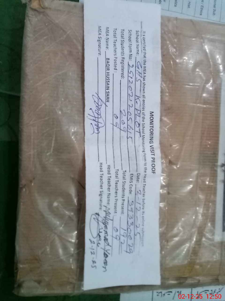 | Attendance Register | Head Teacher | MEA with School | Visit Proof |